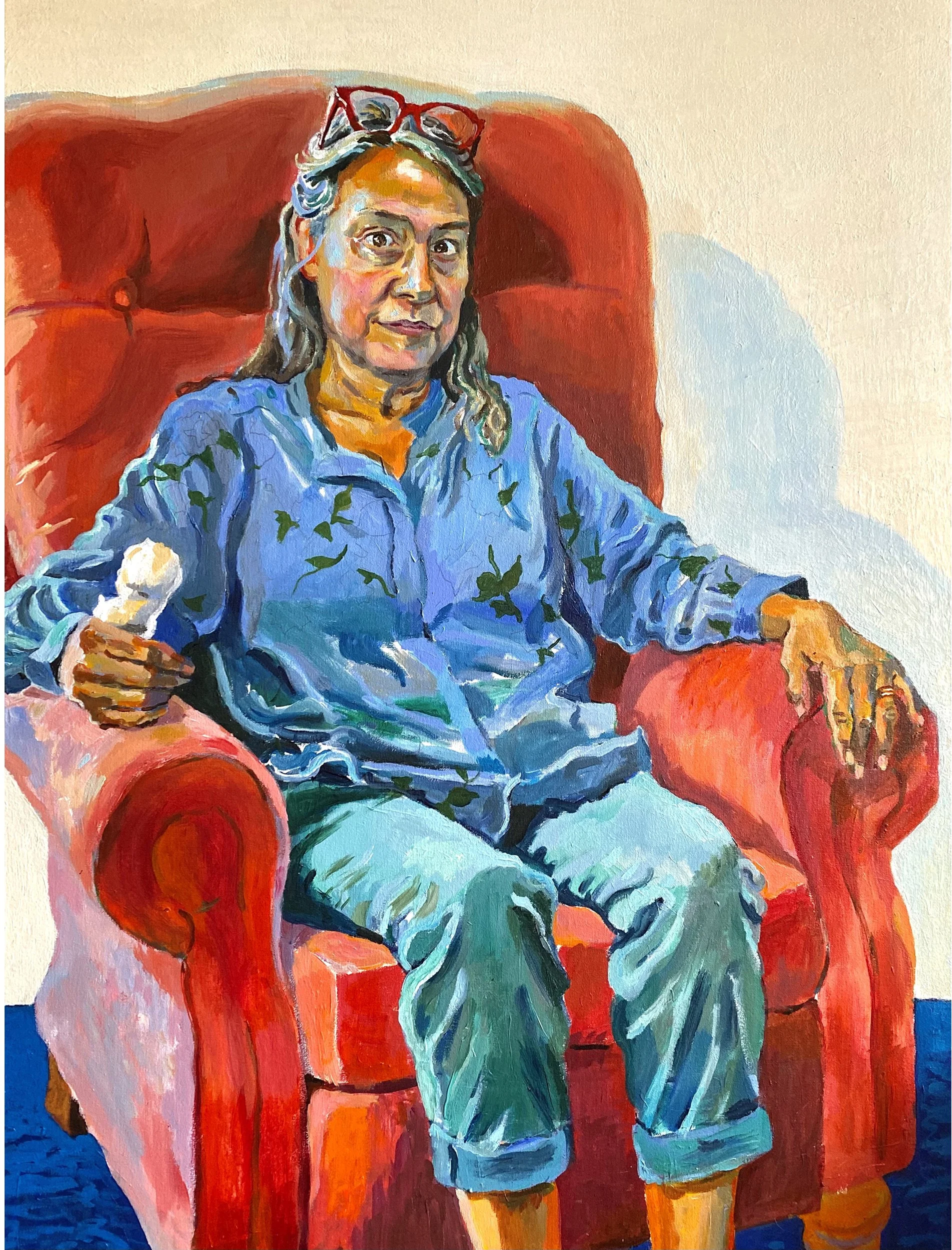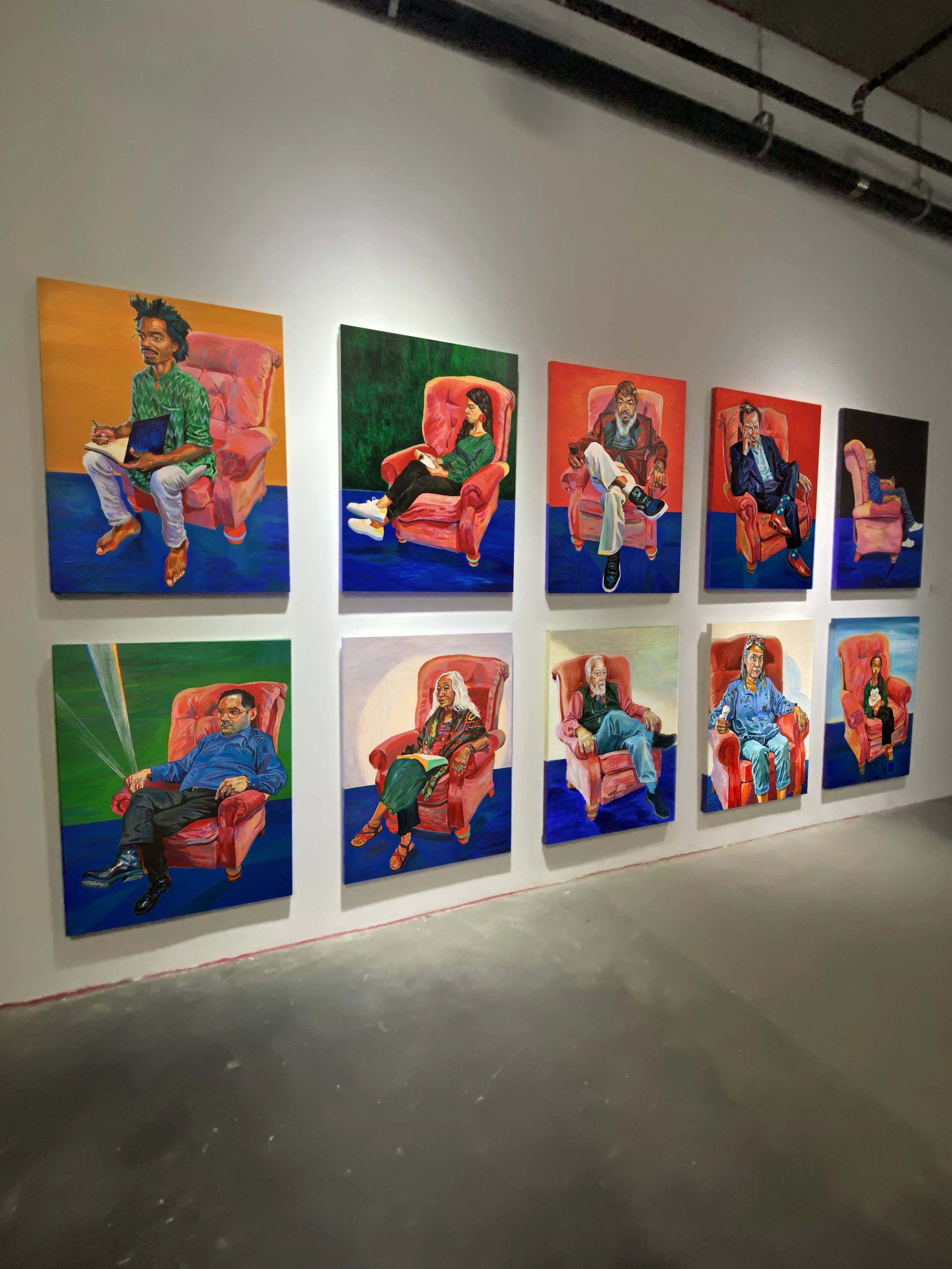 The Pink Armchair Portrait Project began during COVID, when painter Ben Fine, searching for connection amid isolation, spent 18 months creating twelve portraits of friends and family—sometimes separated by plexiglass. The pink armchair emerged as both symbol and stage: a worn, mid-century, living-room recliner anchoring each portrait in a shared physical setting. Seated in the same chair, each sitter occupies a space that is at once communal and deeply personal, revealing subtle threads of connection between strangers while allowing every individual to inhabit their own distinct emotional universe. First exhibited together in a grid, the portraits generated unexpected visual and emotional resonances, highlighting individuality within a common framework and affirming the resilience and vitality of collective human presence.